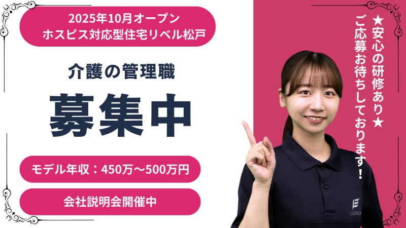 【千葉県松戸市】介護施設の管理職・管理職候補正社員募集要項・ホスピス対応型住宅リベル 松戸