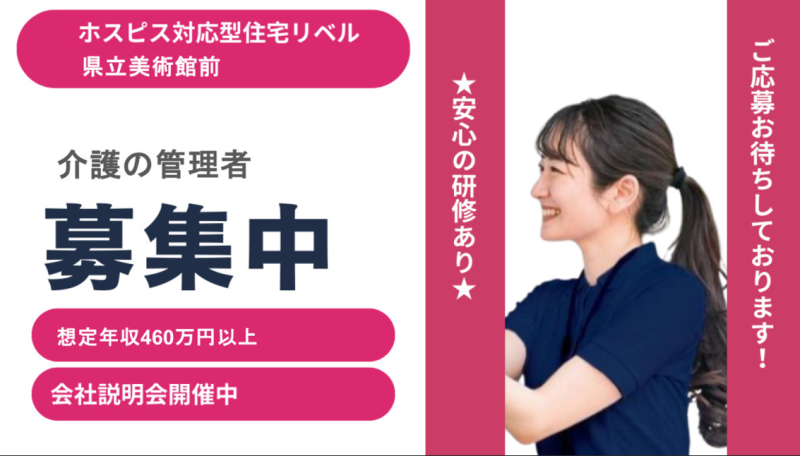 【静岡県静岡市】介護施設の管理職・管理職候補正社員募集要項・ホスピス対応型住宅リベル 県立美術館前
