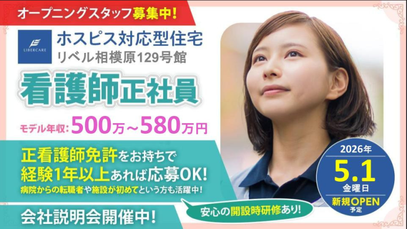 【神奈川県相模原市】看護師正社員募集要項・ホスピス対応型住宅リベル 相模原129号館