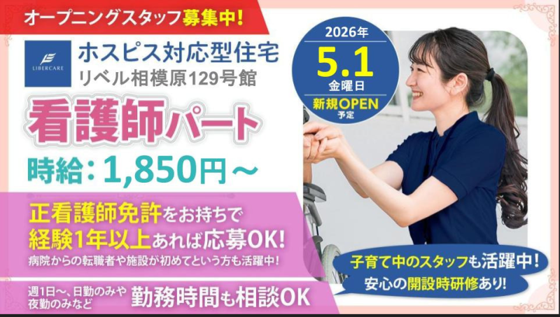 【神奈川県相模原市】看護師パート・アルバイト募集要項・ホスピス対応型住宅リベル 相模原129号館