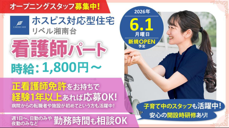 【神奈川県藤沢市】看護師パート・アルバイト募集要項・ホスピス対応型住宅リベル 湘南台