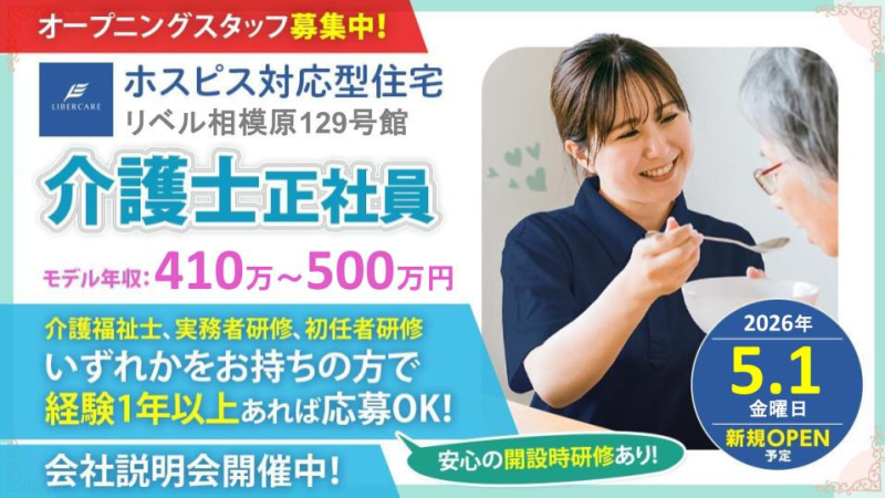 【神奈川県相模原市】介護職・ヘルパー正社員募集要項・ホスピス対応型住宅リベル 相模原129号館